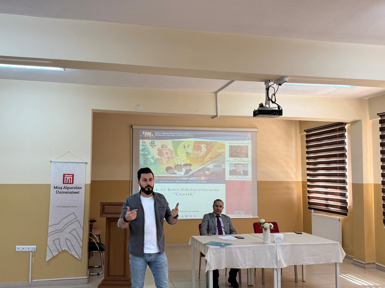 Organized by Muş Alparslan University Bulanık Vocational School, the seminar, titled "Children in Turkish and Kurdish Literature," took place on Wednesday, April 15, 2026, at 11:00 AM in the Bulanık Vocational School Conference Hall. The seminar addressed the place of the concept of childhood in Turkish and Kurdish literature, exploring its cultural, psychological, and developmental dimensions. Expert speakers Prof. Dr. Bünyamin Sarıkaya and Dr. Nevzat Eminoğlu offered important insights into how the image of the child is portrayed in literary works. Mehmet Latif Candemir coordinated the program, which was followed with great interest by students and academics. At the end of the seminar, participants had the opportunity to gain new perspectives on the role of literature in the context of childhood, identity, and cultural transmission.