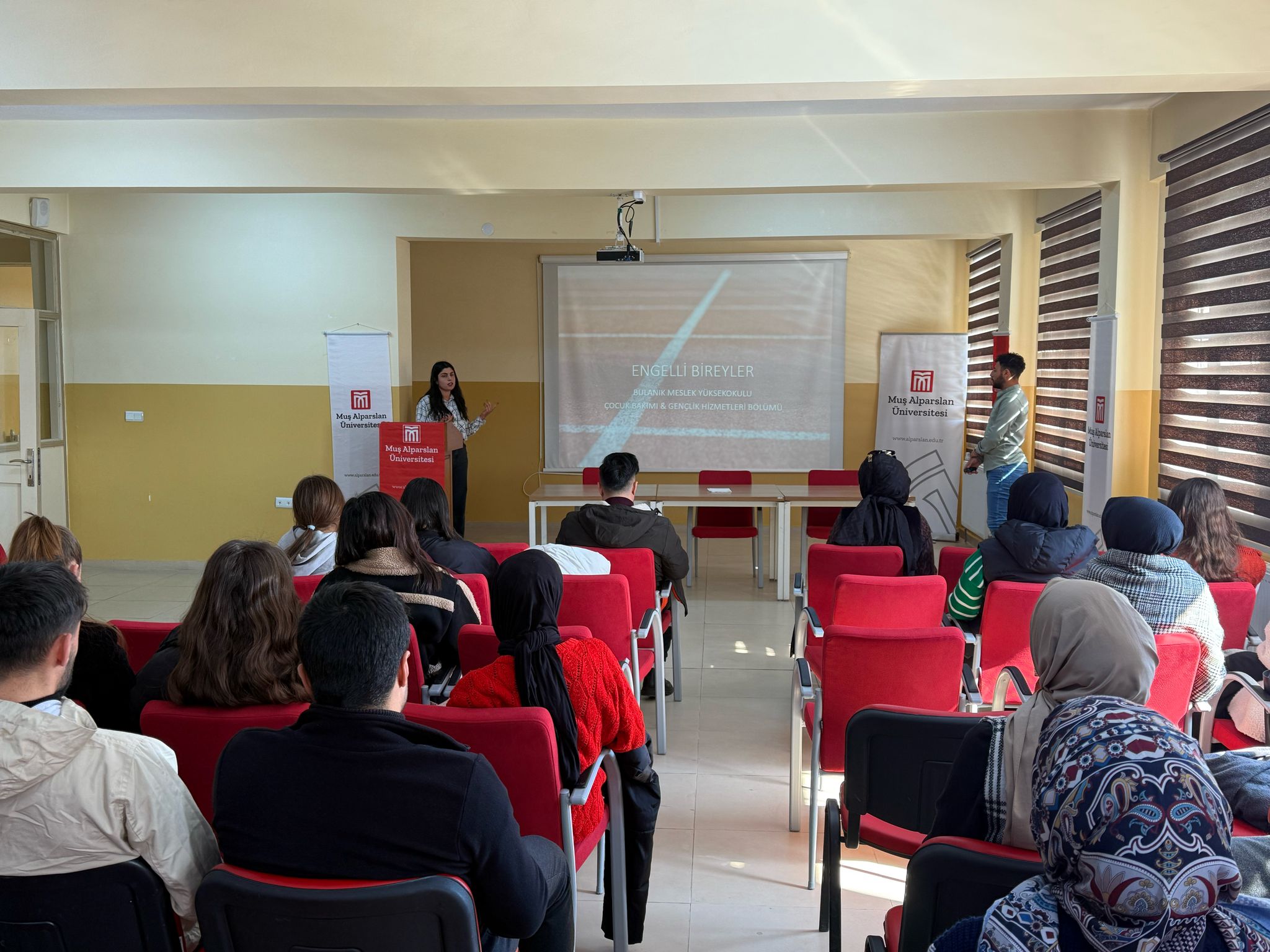Bulanık Meslek Yüksekokulu Çocuk Bakımı ve Gençlik Hizmetleri Bölümü Çocuk Gelişimi Programı öğretim elemanı Öğr. Gör. Burcu KINIK CANDEMİR koordinatörlüğünde düzenlenen “Engelli Bireyler” semineri gerçekleştirildi. Çocuk Gelişimi Bölümü 2. sınıf öğrencilerinden Miroğlu TAN ve Seher KOÇYİĞİT tarafından sunulan seminerde; engelli bireylerin karşılaştıkları zorluklar, eğitim süreçleri, sosyal hayatta yaşadıkları deneyimler ve engellilik konusunda farkındalık oluşturacak çeşitli konular ele alındı. Öğrenciler, yaptıkları sunumlarla engelli bireylere yönelik destekleyici yaklaşımlar ve toplumsal duyarlılığın artırılması gerektiğini vurguladılar.